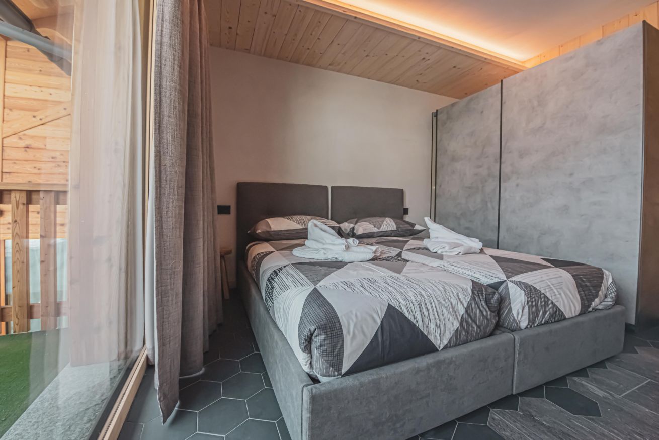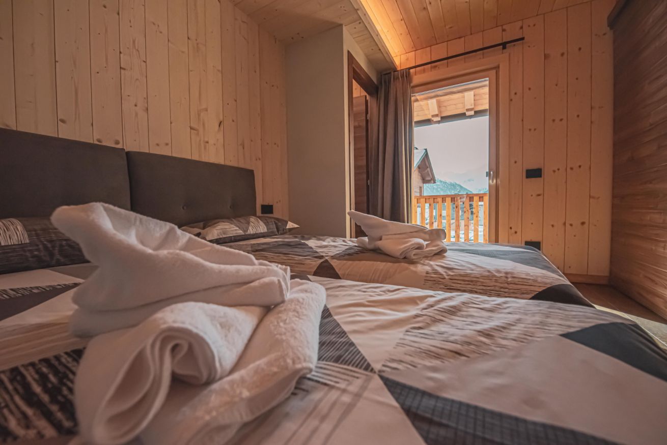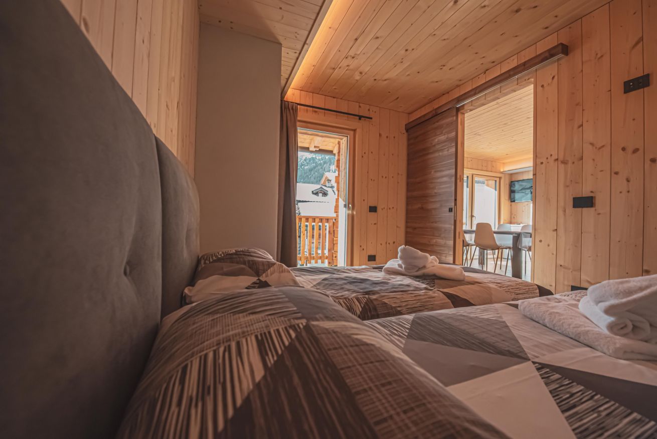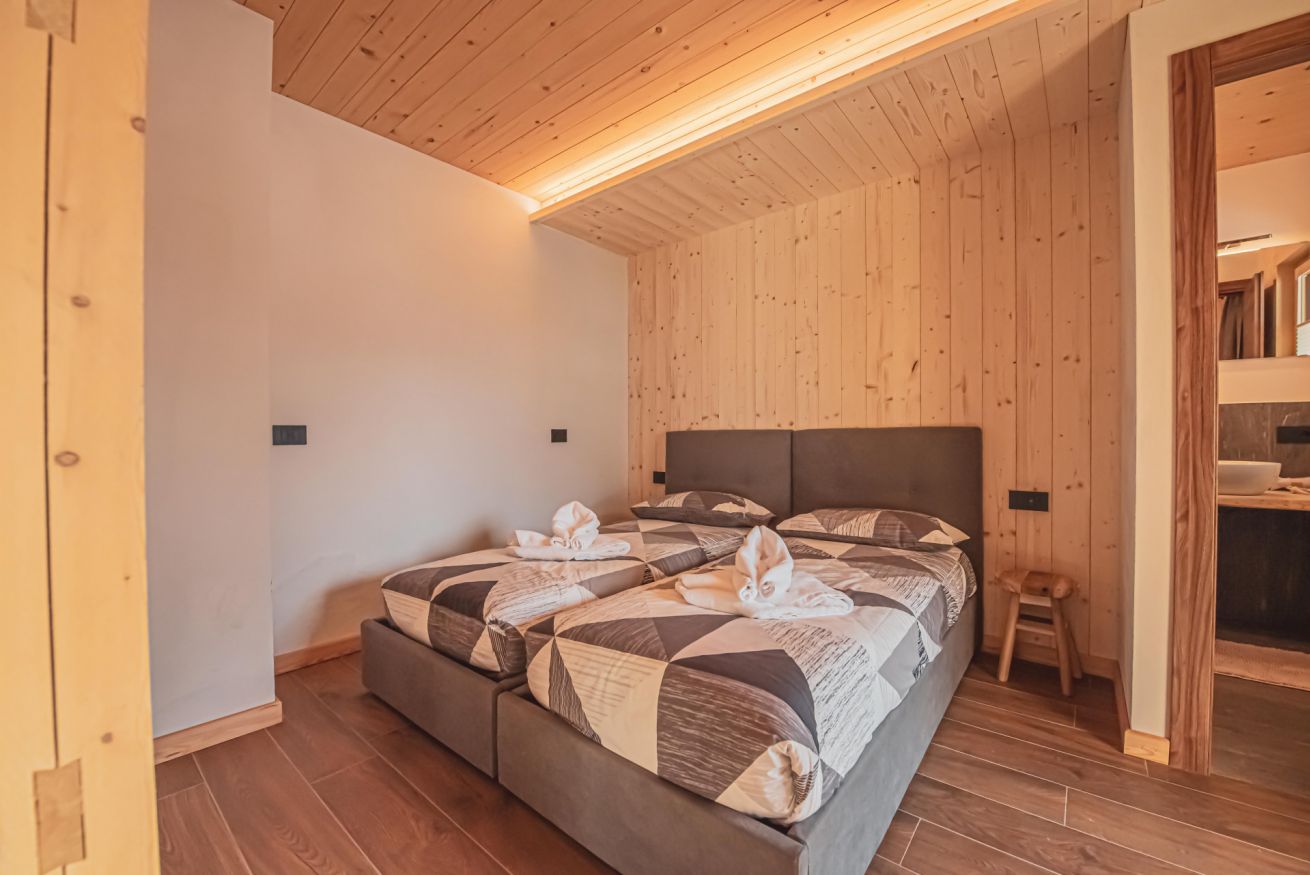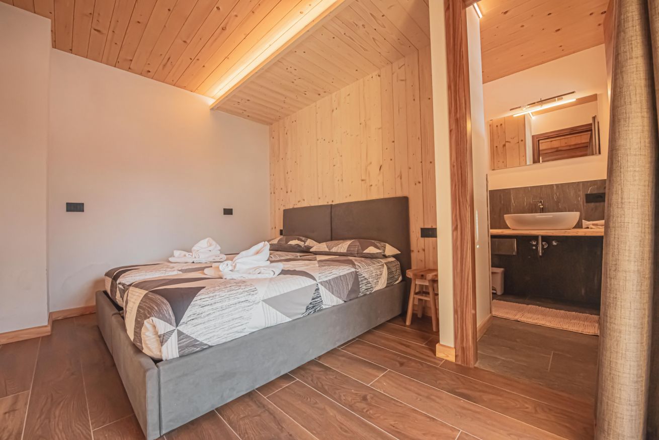 L'appartamento dispone di un ampio balcone con vista sull’esteso giardino comune, accessibile a tutti gli ospiti dello chalet, e regala panorami mozzafiato sulle montagne circostanti. L’atmosfera è calda, accogliente e autentica, ideale per una vacanza in ogni stagione.