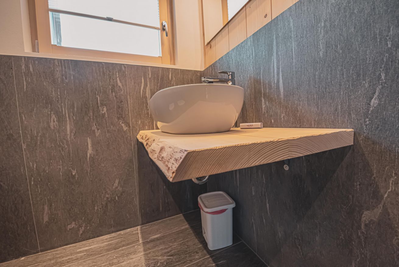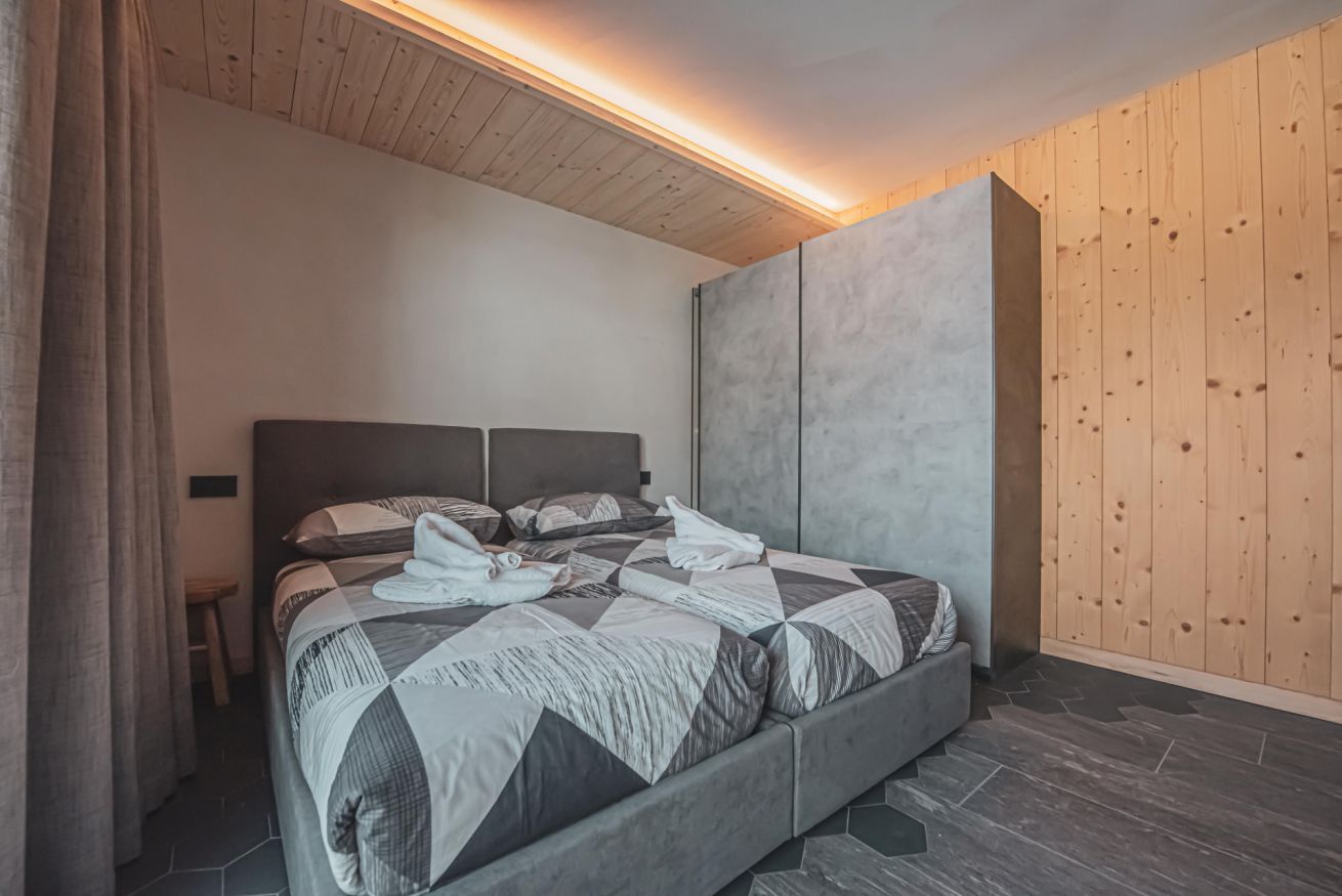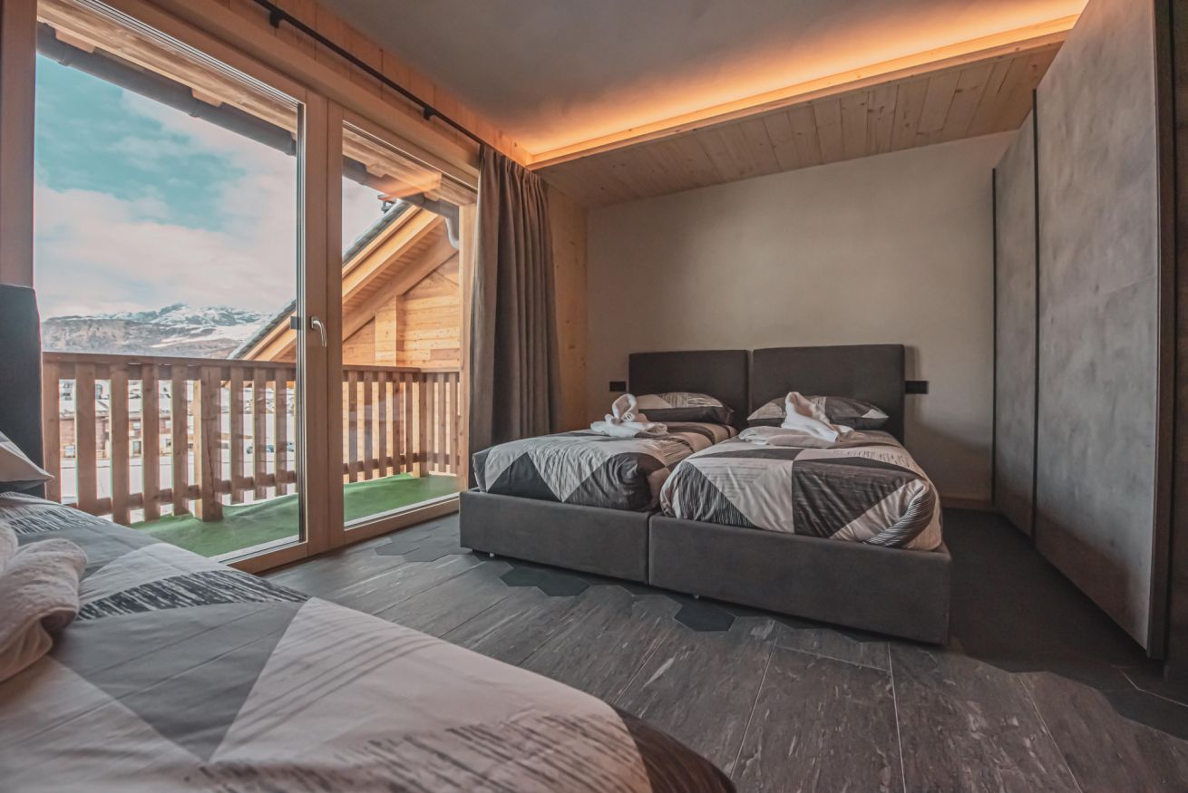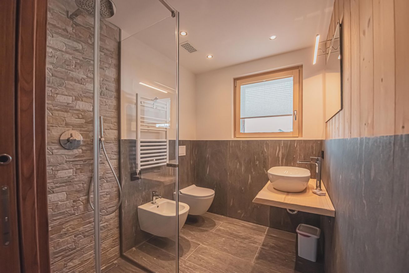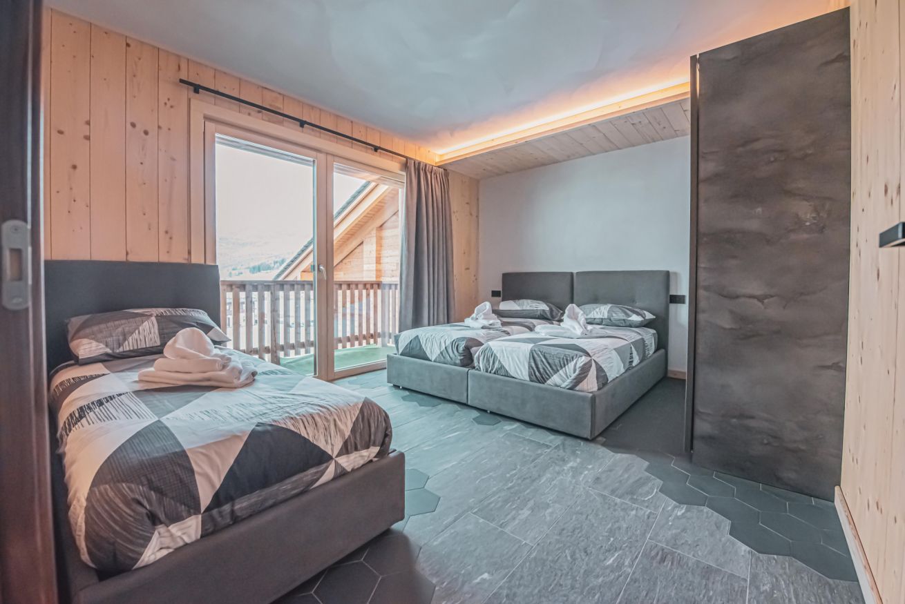L'appartamento dispone di un ampio balcone con vista sull’esteso giardino comune, accessibile a tutti gli ospiti dello chalet, e regala panorami mozzafiato sulle montagne circostanti. L’atmosfera è calda, accogliente e autentica, ideale per una vacanza in ogni stagione.