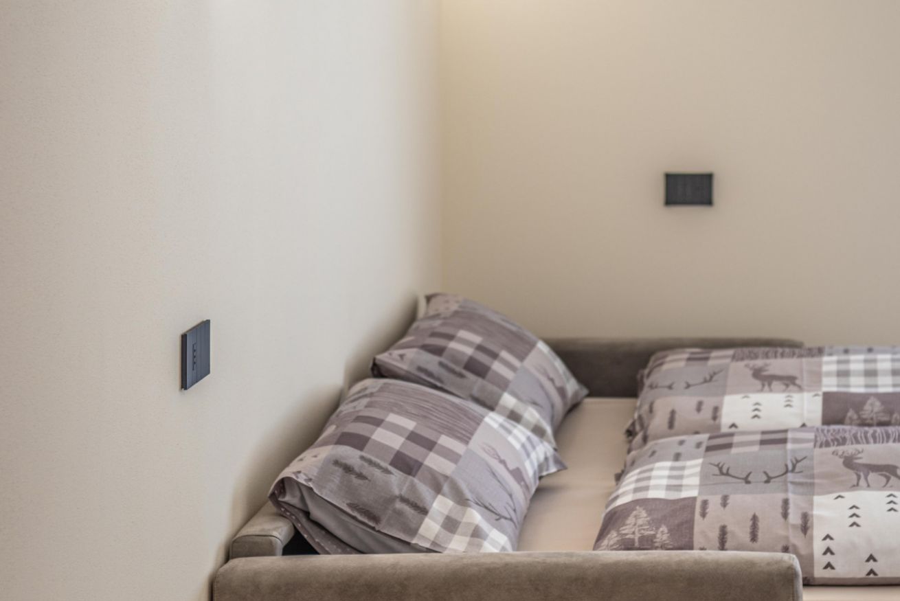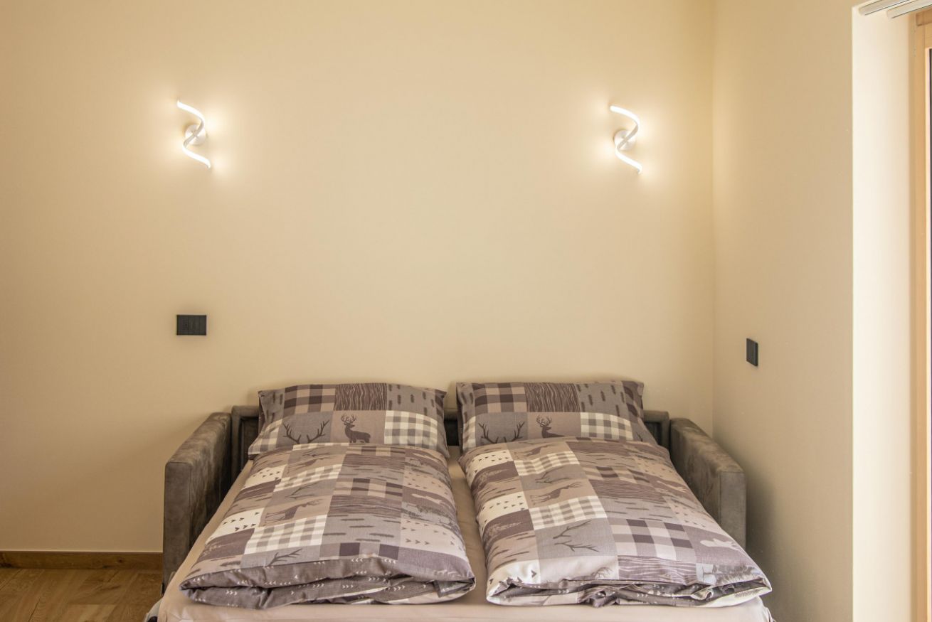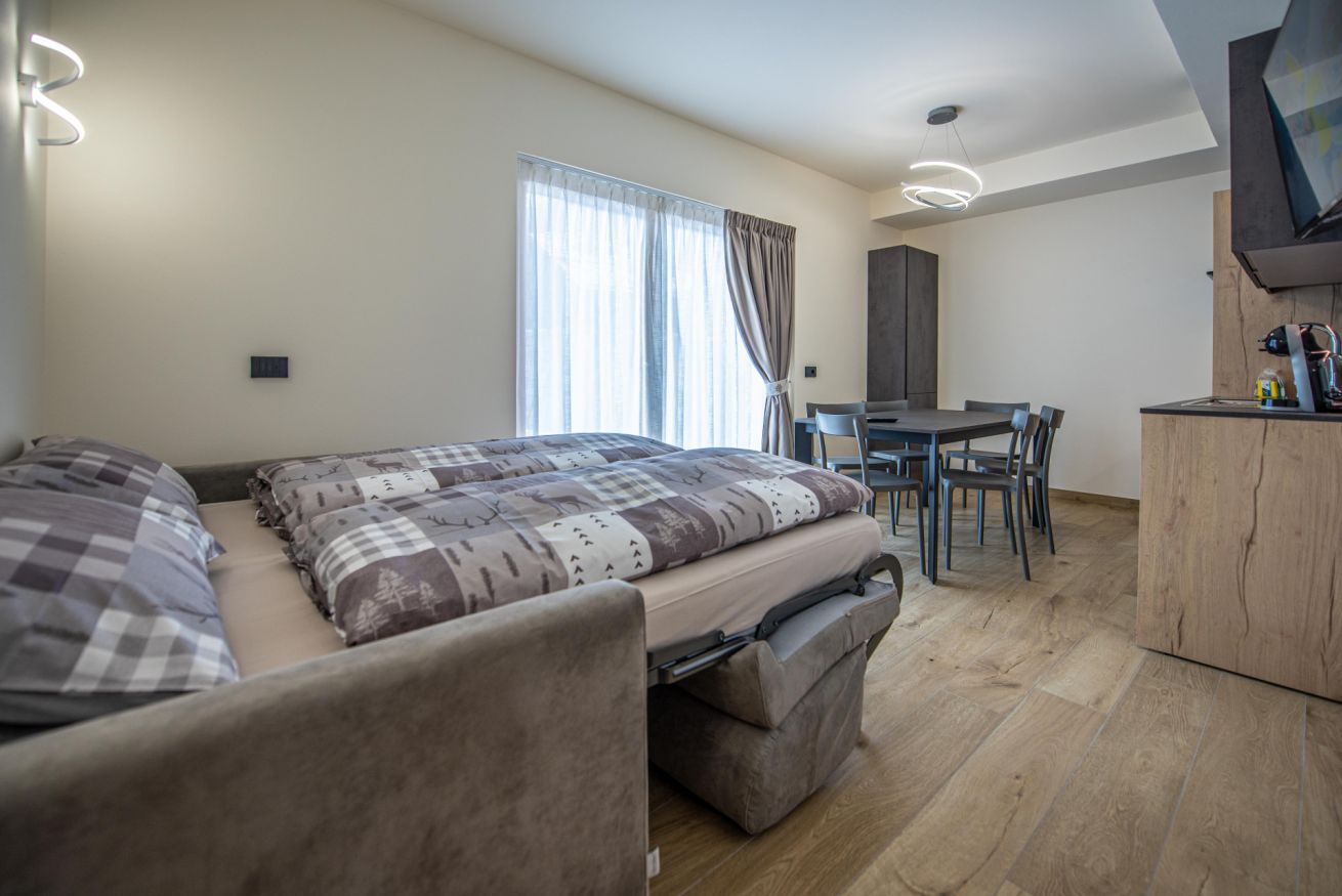 Soggiorno luminoso con un comodo divano letto, ideale per rilassarsi dopo una giornata attiva.